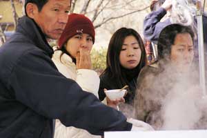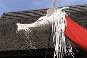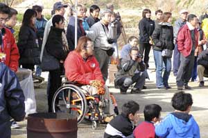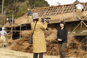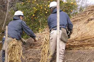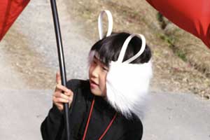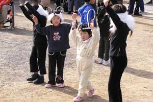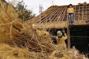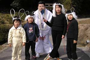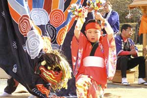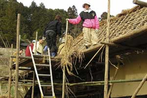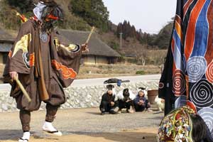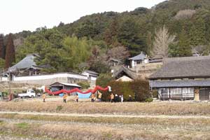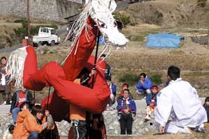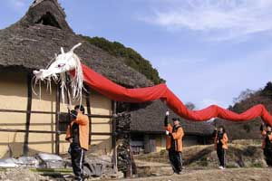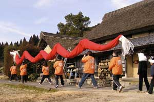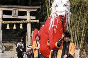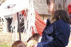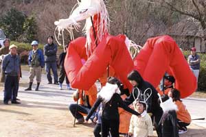 | 「 八 塔 寺 今 昔 物 語 」 岡山県和気郡 吉永町ふるさと村での活動報告 特定非営利活動(NPO)法人あとりえ はらっぱ代表 ふじわら やすえ ◇ 茅葺き家屋へのかかわり 「文化、アート」を中心としながら最近では青少年育成などに関する事業、まちづくりに関する事業等も行うようになってきました。その中で吉永町より、「茅葺き建築物に関するソフト事業でかかわってほしい」との声をかけていただいたのが昨年(03年)8月でした。それ以前には茅葺き建築物等に直接関わる事業は行っていませんでしたが、メンバーに、現代劇だけでなく史実を元にした歴史劇なども手掛ける劇作家や、日本古来の伝統をふまえたデザイン等を強く意識するデザイナーなどが加わっていたことから、この事業への心理的な距離感を感じることなく受け入れる ことができました。 ◇「はらっぱ」ならではの視点で 茅葺きに関わるなかで大切にしたいと思ったことは、おおまかに次の4点をあげることが出来ると思います。 1 茅葺き家屋とそこに住む人の問題解決につながる視点を忘れないように。 2 茅葺き家屋へのアウトリーチ事業を行う。 (茅葺きを楽しむという提案をしながら、茅葺きに関する理解や関心を深めてもらう) 3 八塔寺や吉永町特有の問題に取り組む。 4 歴史や文化からの視点を持つ。 そうして今回の草葺きシンポジウム準備委員会のみなさんや行政関係の方、地元の多くの子どもさんたちや地元青年団の方に多大な協力をいただいて行ったのが八塔寺今昔物語(資料1)でした。(ちょっと意外なうれしいニュースとしては、この事業への参加を、岡山市内周辺に住む10代、20代に呼びかけたところ、予想外に好反応があったことです。しかも、ただ参加して楽しみたいというだけでなく、スタッフとしてなにか役に立つことはないかという申し出が多かったので声をかけた側の責任を感じるとともに、新たな可能性を感じました。) ◇ こどもたちを巻き込む作戦 その1 地元の妖怪・伝説探し! まず、地元に残る言い伝えや伝説を探す所からはじめました。古い土地柄だけあって、その物語性の豊かなこと!メンバーで夢中になって吉永町史を読みあさりました。そして印象の強かった事柄を話し合い、アイデアを出し合いました。その中から「ぐひん」「べろだし」「おどくうさま」などについて、地元のこどもたちからデザインを募集し、ステキな作品をスタンプにしてイベント中にスタンプラリーをすることにしました。どれくらい反応があるのか見当がつかなかなかったのですが、箱をあけてびっくり、応募者多数&優秀作品の多さに、選考会は大難行でした。(「ぐひん」や「べろだし」について詳しくは「はらっぱ」の展示の方をご覧ください (^_^) ) ◇こどもたちを巻き込む作戦 その2 出演者募集! また、地元の文化資源を活かす方法として、この豊かな物語をたくさんつないで地元の人と一緒に現代の新しい神楽を作ろうと考えました。メンバーとして参加してくれていた脚本家に 1 八塔寺ふるさと村全体を舞台とし、その地形からとれる場の意味、音の響きを十分に活かす 2 地元の人から出演者を公募する 3 地元に残る[神根獅子舞]を劇中劇として出演を依頼し、[寿ぐ(言祝ぐ:ことほぐ)をテーマとするという注文をつけて脚本と演出を依頼しました。地元町内に出演者を募集して練習し、下見や話し合いを重ねた結果、以下のような特徴をもった神楽を制作上演することができました。 1 日本の伝統芸能のひとつ文楽の手法を取り入れ、出演者は、演じ手と語り手の二人一役となって登場する。 2 今も現存する八塔寺の吊り鐘に装飾されている龍をもとに全長二十メートルの真っ赤な大龍が登場。この龍は、日本の伝統工芸である竹細工の「籠編み」の手法を参考に、竹を紙に替えて、このNEO神楽のために制作された新作もの。また龍を操作演じてくれたのは地元青年団のみなさん。 3 地元の人によって永く伝えられ演じられてきた吉永の獅子舞も、その龍の嘆きや怒りを鎮める大切な役として、物語中に登場。 4 音楽は和太鼓を中心とした打楽器で構成したオリジナル作曲。 5 演奏の一部に、一般参加者による当日参加も可能とする。 ◇ 参加者だけの楽しいおみやげ! 宿泊体験の日に、吉永町の土を使って、参加者一人一人が、成形してその場で七輪で焼き上げる土笛を作りました。七輪で真っ赤に焼き上げるまではドキドキでしたが、「ぽー、ぽー」とかわいい音が出た瞬間には参加者がどよめくほどの好評でした。何人かはいくつかの音階を出すことにも成功していました。また、焼く過程での化学変化に興味津々の子どもさんがいてその会話が楽しかったり、焼成時の焼き縮みで音が出なくなった女の子が、吹き口にちょっと紙を当てるだけで音が出た時のうれしい顔にはこちらも感動しました。(その後そのお子さんは、当てた紙を止めるまで眠ることが出来なくて、お父様は凍てつく真夜中、車までセロテープを取りにいかれ