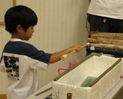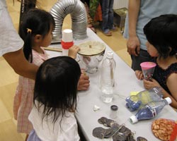 楽器作りにもいろいろと工夫をしました。これは主に はらっぱ副代表の竹岡氏の担当だったのですが、外の入れものや、音の元になる中身の材料などを探しにあっちにうろうろこっちをうろうろノ。試作物を写真に撮ってともさんにおくって意見を聞いたり、たいへんだったけどとても楽しく、勉強にもなった経験でした。